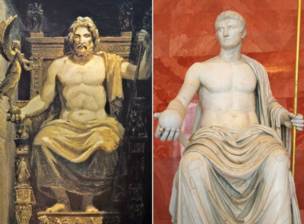 Dia merupakan penguasa surgawi yang menguasai seluruh dunia, sosoknya sangat akrab mulai dari patung terkenal dengan rambut panjang dan berjanggut seperti Dewa Zeus dari Olympia yang berada di tahta, sebuah patung yang juga terkenal yaitu Kaisar Roma Augustus telah meniru dirinya dengan gaya yang sama (tanpa rambut panjang berwarna keemasan dan janggut).
